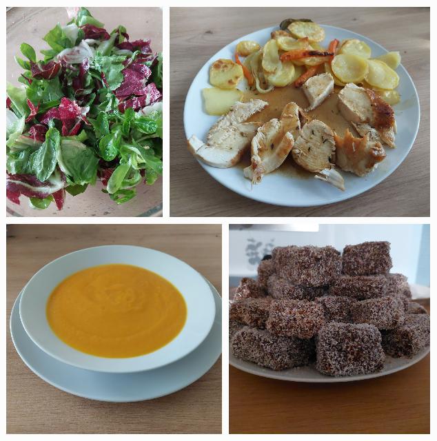 Juha iz maslene buče, popečene pišč.prsi s timijanom, česnom in maslom, reducirana omaka od pečenja, pečen krompir s papriko in korenčkom, mešana solata, koksove kocke z rumom: