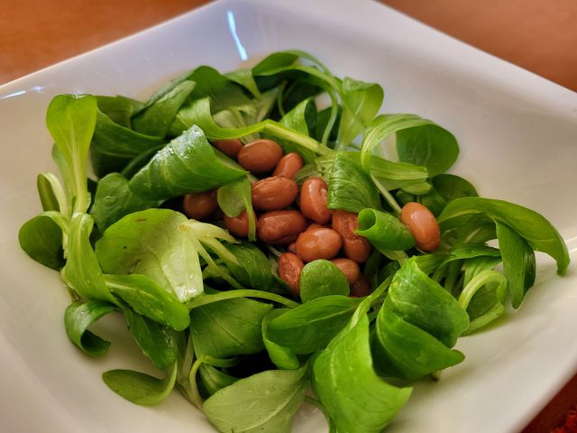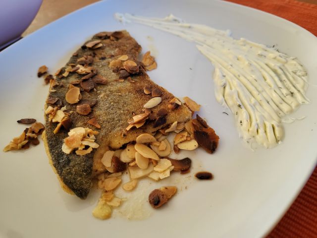 Danes aktivni dan in hrana na hitro - zame file postrvi z mandeljni, motovilec s fižolom, moja dva sta šla na hamburger v bližini.