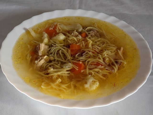 Kokošja juhica z rezanci; kuhan skutni štrukelj