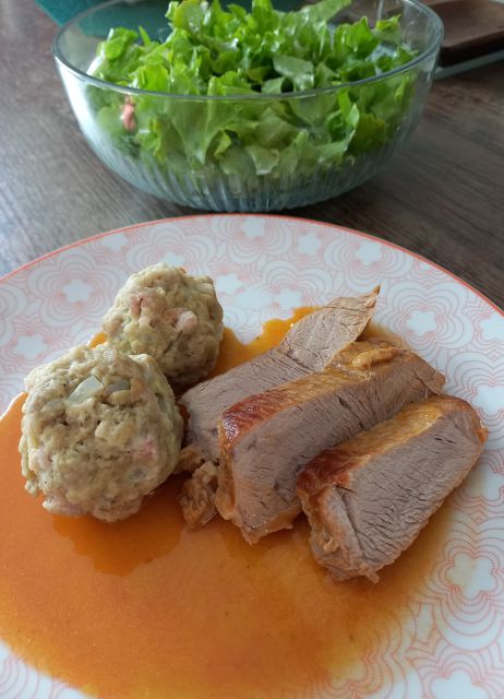 Kokošja juhica (od včeraj); telečja pečenka v omaki, kruhovi cmoki; zelena solata