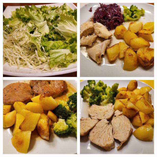 Včeraj pečena piščančja prsa, svinjina, pečen krompir, brokoli, zelena in zeljna solata