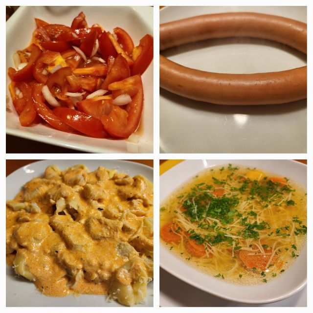 Danes zame kokošja juha, za moja dva goveja z rezanci, za moža hrenovka, kruh, paradižnikova solata, sin praktično za večerjo torteline s sirovo omako