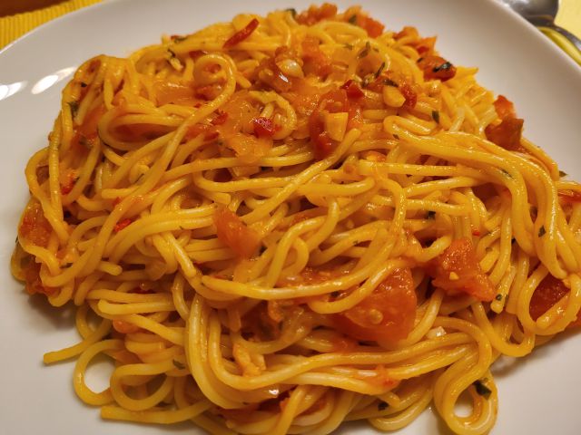 V petek špageti s čilijem, česnom in paradižnikom, solata