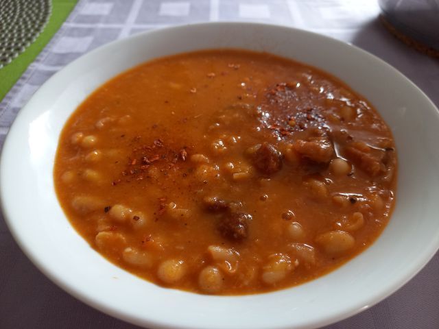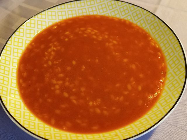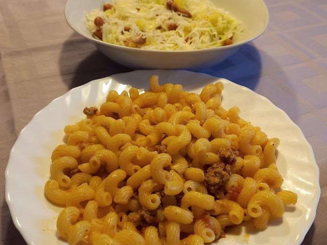 Paradižnikova juhica; makarončki z bologne omako; zeljnata solata s fižolom in krompirjem