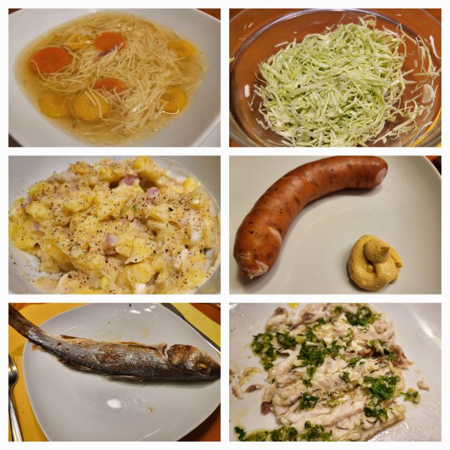 Včeraj iz zaloge goveja juha z rezanci, za moža krompirjeva solata, kranjska klobasa. Zame pečen brancin, zeljna solata/ krompirjeva.