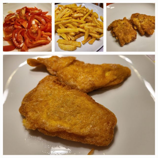 Danes kosilo na hitro - pariški zrezki ( puranji/ svinjski), zame pečen puranji zrezek, pomfrit, paradižnikova solata, zame še zelena, zeljna in krompirjeva solata.