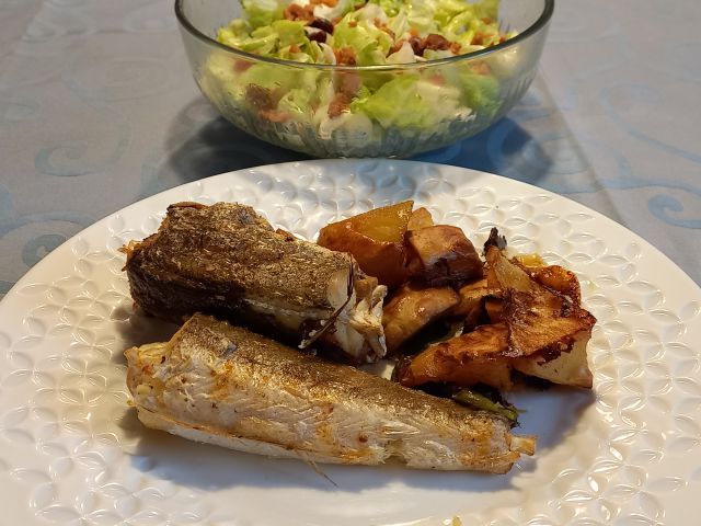 Pečen oslič s krompirjem, štrucar s fižolom in ocvirki