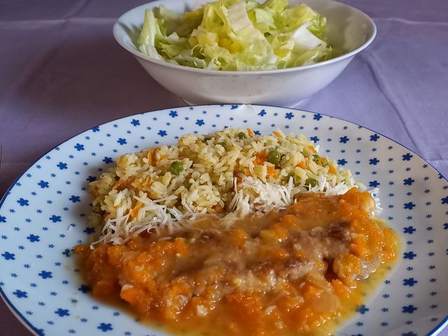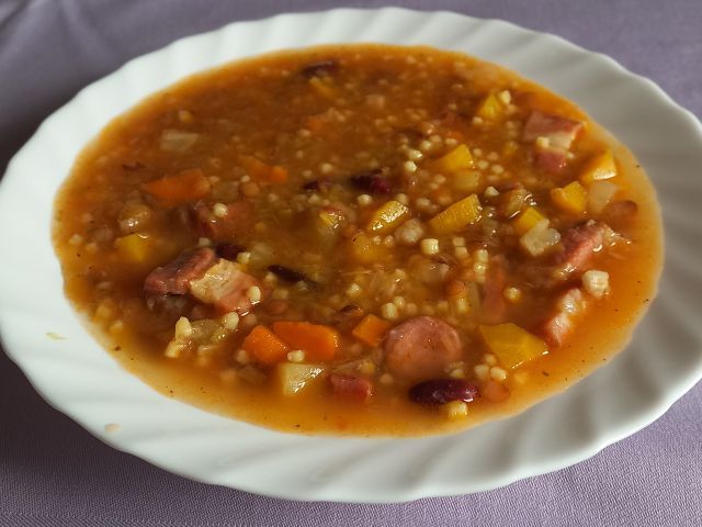 Bučna juhica; pečen puran, mlinci; rdeča pesa