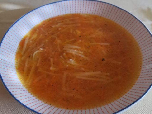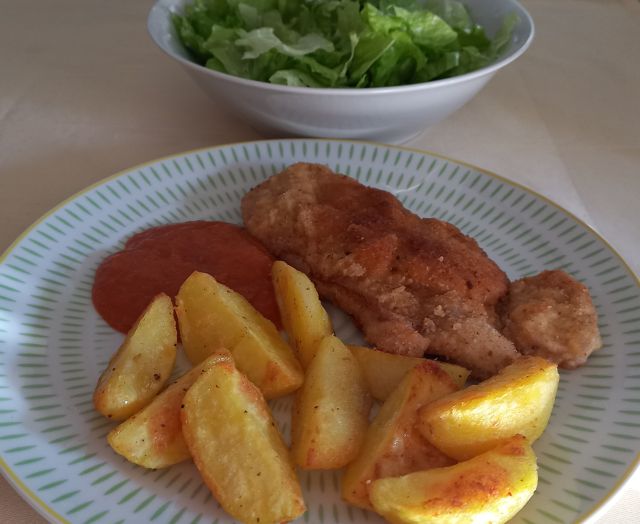 Korenčkova juhica; paniran sv.zrezek, pečen krompir, paradižnik zos; zelena solata