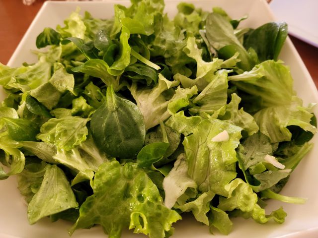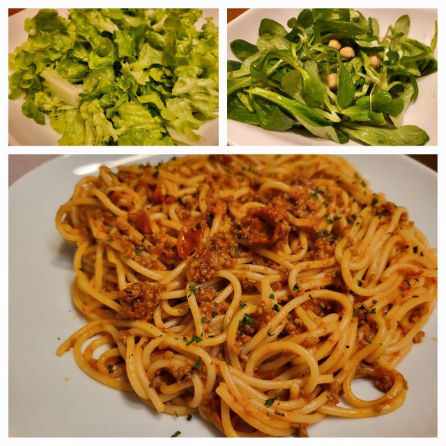 V sredo špageti bolognese, motovilec s čičeriko in zelena solata