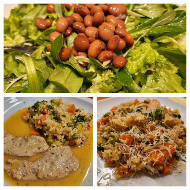 Piščančja rižota z zelenjavo zame in sina, za moža svinjski zrezek in zelenjavni riž, solata