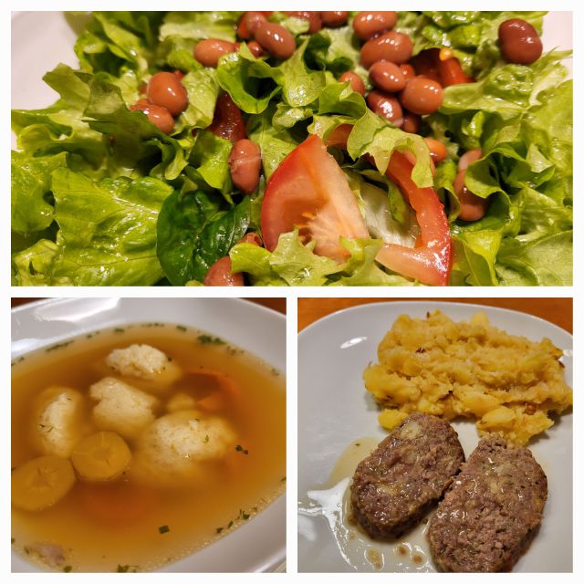 Ostanek goveje juhe, ostanek stefani pečenke, pražen krompir, mešana solata