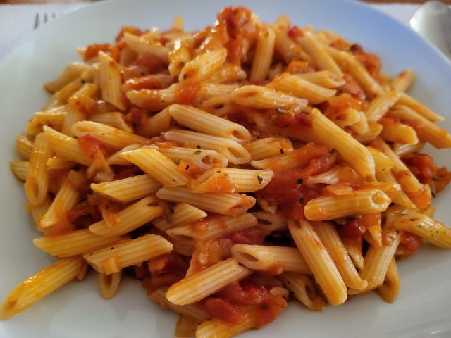 Včeraj testenine s paradižnikovo omako. Solata.
