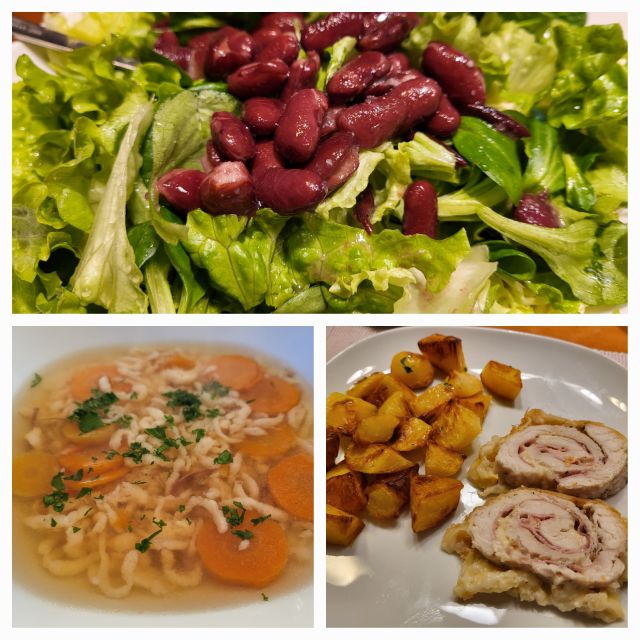 Danes goveja juha z vlivanci, piščančja rulada in svinjska rulada v testu, pečen krompir, mešana solata