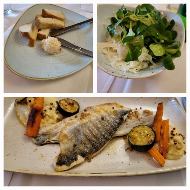 Izbrali smo juho, moja dva zrezka z gobicami, jaz file brancina, solato..