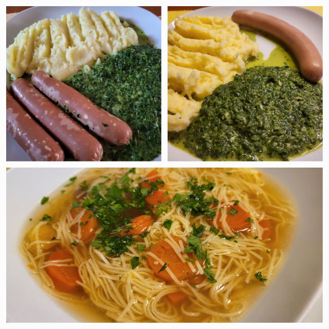 Danes goveja juha z rezanci, špinača, pire krompir, hrenovke