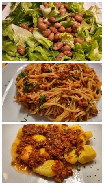Mesna omaka, špageti, bučni njoki, solata s fižolom