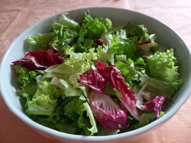 Piščančji in svinjski ocvrti zrezki, riž s korenčkom in cvetačo, endivija s fižolom.