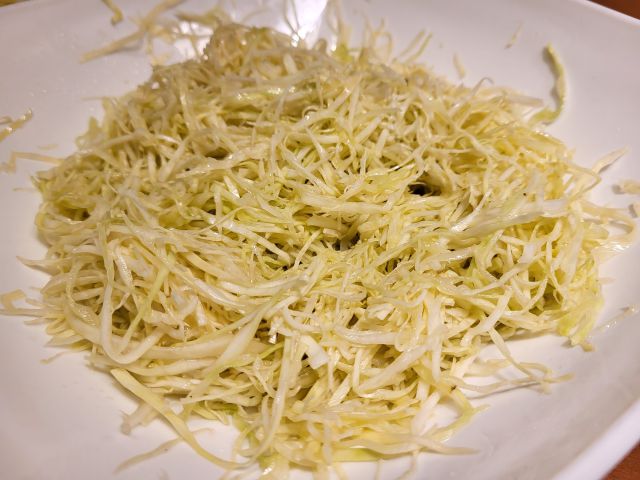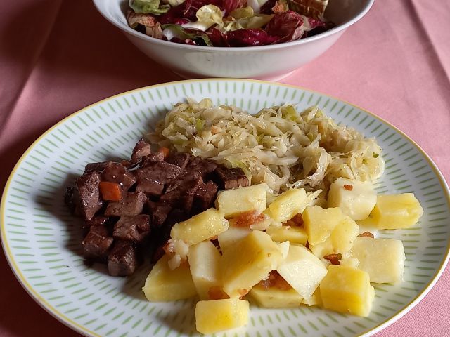 Dušeno sladko zelje, z ocvirki zabeljen krompir, nakockan kos pečenke; radič s krompirjem