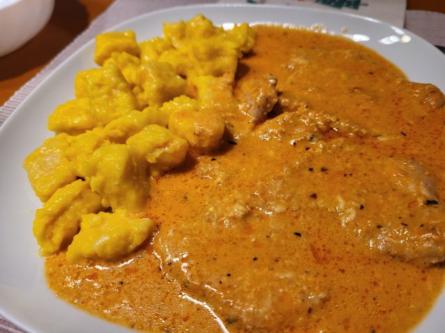 Včeraj zrezki v sirovi omaki in bučno- skutni njoki, zeljna solata. Malo mi je nagajala masa za njoke, ker sem tik pred izdelavo ugotovila, da mi je zmanjkali ostre moke
