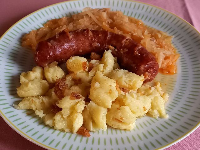 Kisla repa, zabeljeni koruzni žganci, klobasa (nogarškova)