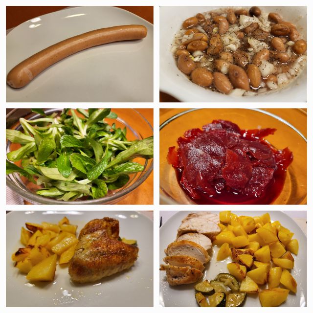 Danes tudi mešano, za naju s sinom piščanec, pečen krompir, motovilec in domača rdeča pesa. Mož si je zaželel fižolovo solato, hrenovko in kruh.