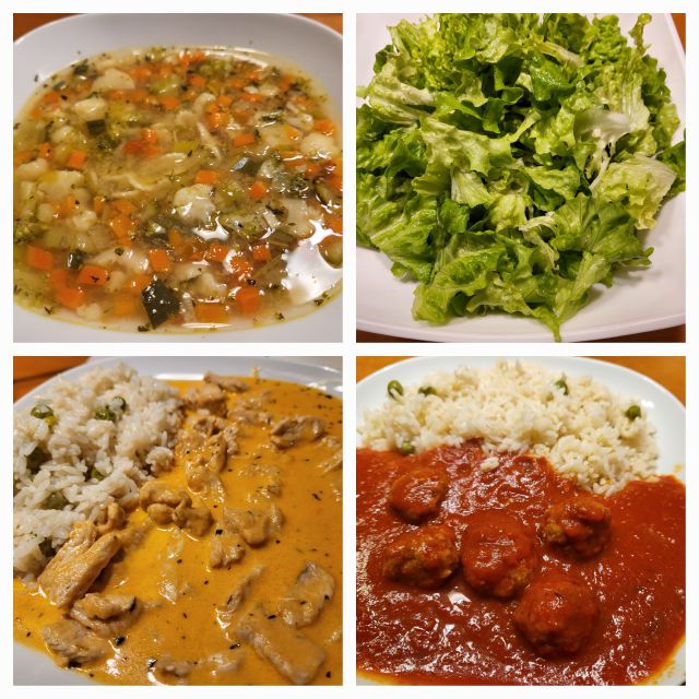 Včeraj ostanek zelenjavne juhe, ostanek čuftov in riž, za sina zvečer puranji trakci v omaki, riž, zelena solata