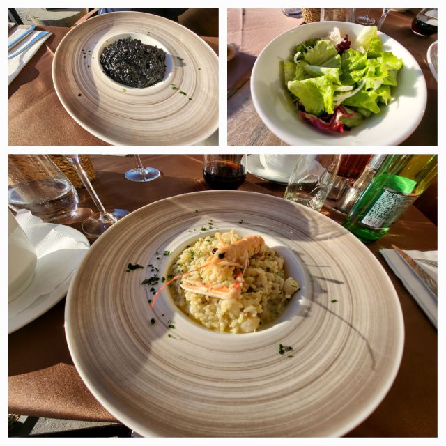 Danes kosilo na zunanji terasi. Oba sva morsko. Moja rižota s škampi je bila zelo dobra, moževa črna rižota ni bila okusna. Sipa izredno mehka, ogromno črnila, rižota brez aromatičnosti.