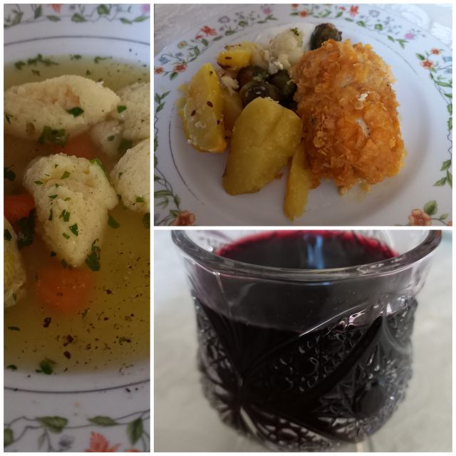 Kokošja juhica; piščančji zvitki, krompir, zelenjavni miks; vino; pecivo