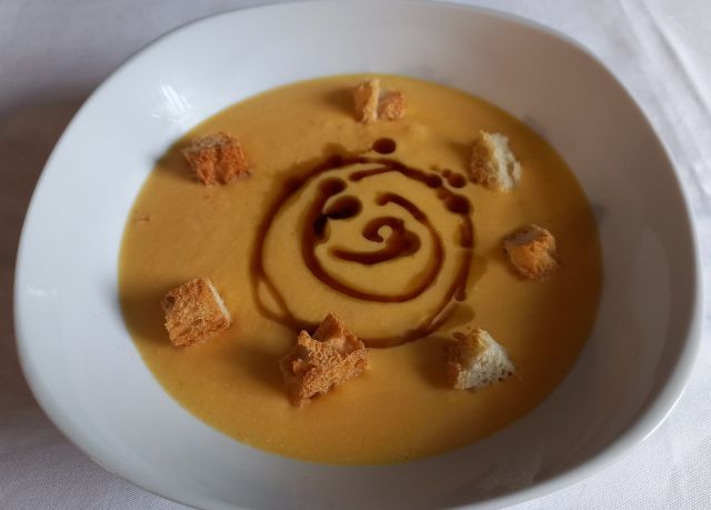 Bučna juhica s krutoni; telečja pečenka, krompir; radič z rdečo peso