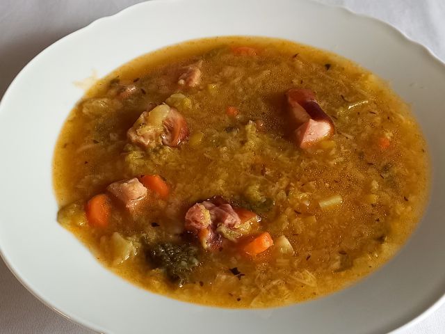 Kostna juha,golaž iz bočnika, zdrobova rolada, solata,sadje,kava,piškoti