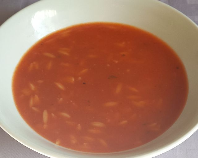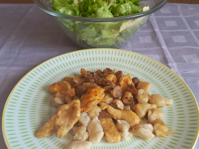 Paradižnikova juhica z rizoni; piščančji trakci s šampinjoni in ščipanci; zelena solata