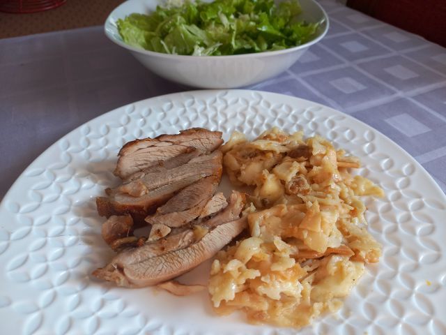 Goveja juhica z ribano kašo; puranje od bedra, mlinci; zelena in zeljnata solata