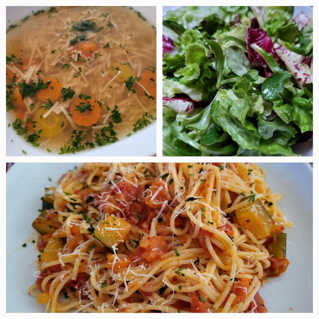 Danes goveja juha, špageti z zelenjavno omako, mešana solata