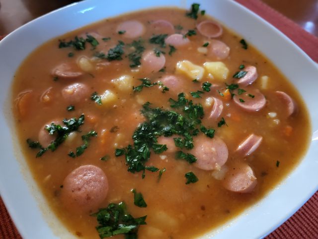Danes krompirjev golaž s hrenovkami, zelenjava, kruh.