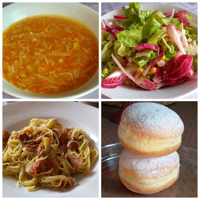 Porovo-korenčkova juhica; špageti s pesto genoveze in pršutom; radič s krompirjem in koruzo; krofff