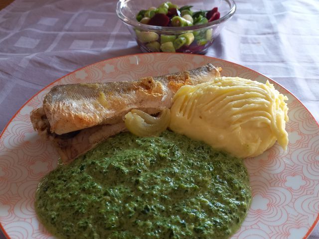 Juhica (kar iz vrečke); pire krompir, špinača, pečen oslič; rdeča pesa z mlado čebulo