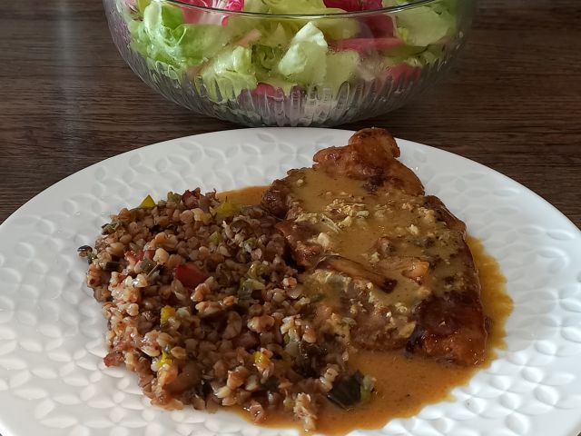 Goveja juhica; ajdova kaša na poru in slanini, sv.zrezek v omaki (gorgonzola in vino); radič s krompirjem in ocvirki