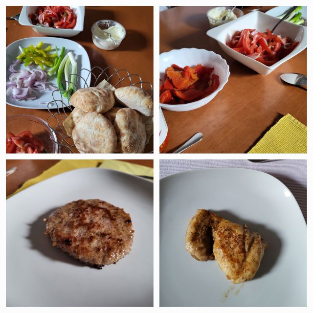 Včeraj pleskavice, bedro brez kosti, paradižnikova solata, pečena paprika, zelenjava, kajmak, lepinje