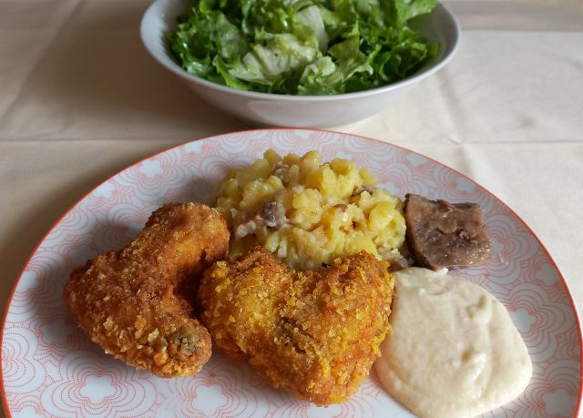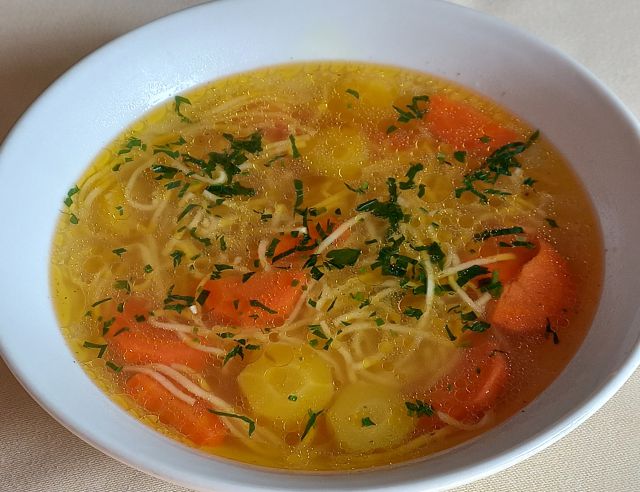 Goveja juhica z rezanci; pražen krompir, panirane perutničke, "oglodan" goveji rep, hrenov zos; zelena solata