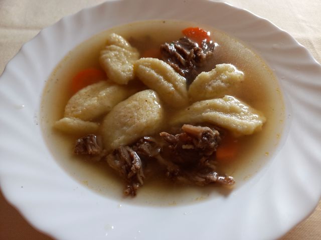 Jurčkova juha, srna v omaki, spätzle, solata, makov kolač s čokolado, kava