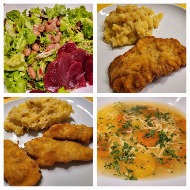 Danes goveja juha z rezanci, meso na dunajski način ( puran, svinjski, piščančji), pražen krompir, mešana solata. Za sladico orehova potica in rose penina z jagodami.