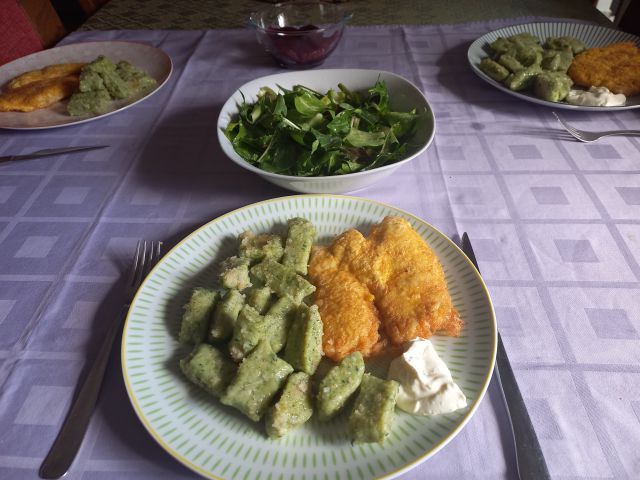 Zeleni njoki, piščančje po dunajsko / pariško, tatarska omaka; še vedno "dračje" (radič / regrat)