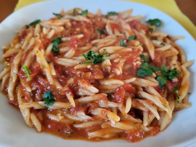 Danes omaka ( veliko česna, svež čili, bazilika, peteršilj in domača paradižnikova omaka iz ozimnice), parmezan in nove testenine Barilla Trofie, zelena solata.