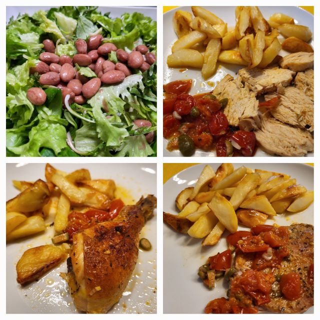 Včeraj pečeno meso ( piščanec, svinjina) s češnjevim paradižnikom, kaprami, začimbami, pečen krompir, solata z regratom in fižolom