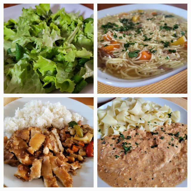 V ponedeljek kitajska hrana za del družine, za moža goveja juha z bogato zakuho rezancev ( to obožuje), zrezek v omaki s širokimi rezanci, zelena solata
