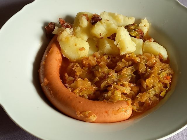 Prisiljeno zelje, zabeljen krompir, hrenovka