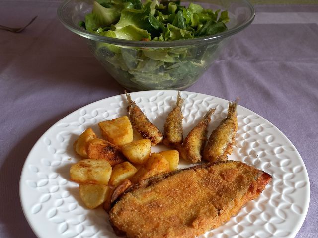 Panirani malancani, sardelice, pečen krompirček; zelena solata z radičem