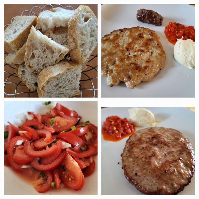 Danes pri nas pleskavice (ena piščančja in 2 čevapčiča iz zaloge) , kajmak, mlada čebula, ajvar polpekoči, paradižnikova solata s paradižnikom Lušt, drožni kruh