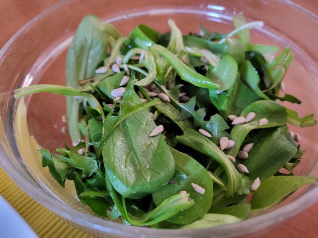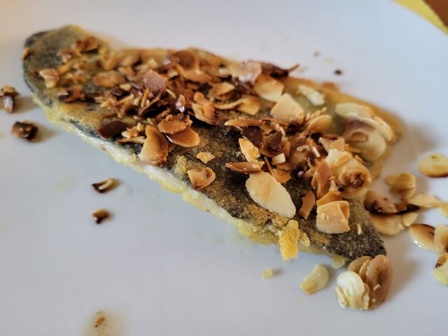 . Po povratku sta šla moja dva na pizzo, jaz sem si spekla file postrvi z mandlji, zraven domač motovilec ( vzgojen na balkonu) in regrat s semeni.